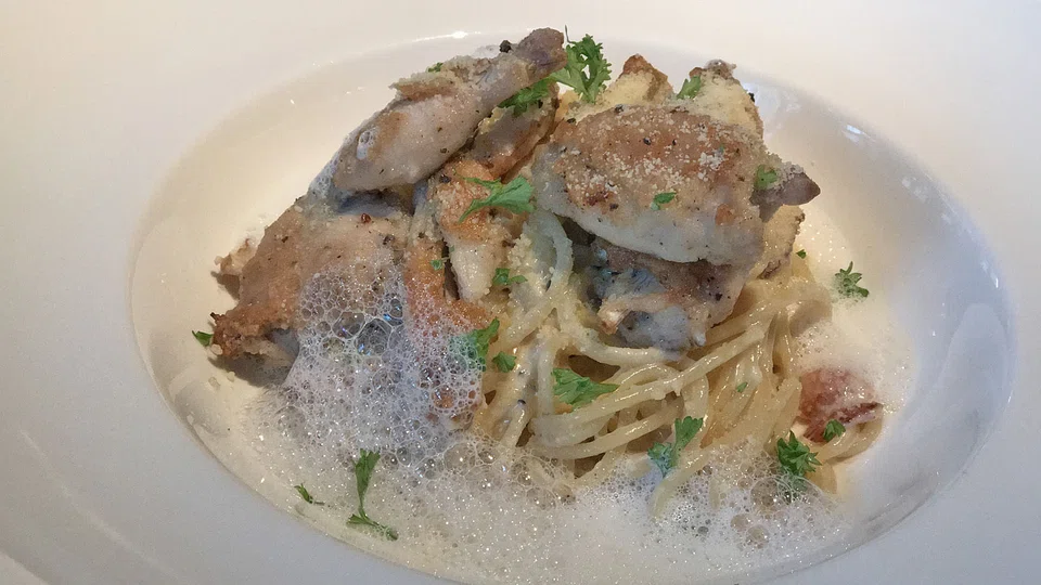 This being styled as a French bistro, we must, of course, try the frog legs (S$30). Pan-fried in a light coating of breadcrumbs, they are salty and taste like chicken wings, but go rather well with the rib-stickingly rich but eventually cloying pasta carbonara - a tangle of spaghetti coated in a slinky, rich coat of cream, cheese and bacon bits.