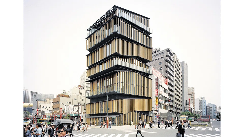 Mr Kuma designed the Asakusa Culture Tourist Information Center (2012) in Tokyo as seven odd-shaped, single-storey units stacked randomly on top of each other. He describes it this way: "Our design consideration was to define the relationship between exterior and interior, by exploring the layered qualities of the façade. Sometimes people misunderstand that the façade is the symbol of the building, but we are just trying to define this relationship." He concludes, "Like blurring the edges, casting shadows and light or expressing the passage of time, layers can create a new relationship between humans and nature."