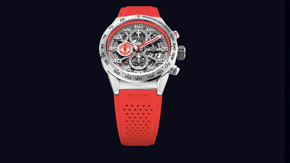 TAG Heuer has unveiled two Manchester United special editions just in time for the kick-off of the new Barclays Premier League season. The first model is a TAG Heuer Carrera Heuer 01 (pictured) dressed boldly in the club's traditional colour of, what else, but red. It's a statement piece with a case diameter of 43mm and the Manchester United logo appearing on both the 9 o'clock subdial and caseback of this sporty watch. Visible through the anthracite skeleton dial is the Heuer-01 chronograph movement.