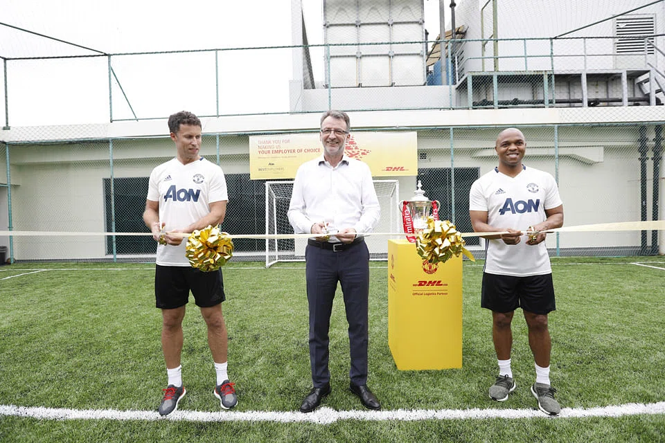 FIFTY DHL employees had a real treat at work on Wednesday when two former Manchester United players popped by their office for a visit.