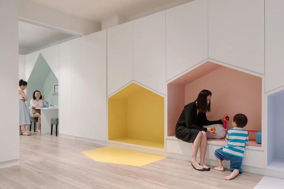 Hence, an open space for children to have fun takes the place of monotonous tables and brightly coloured reading nooks set in the walls are used for lessons.