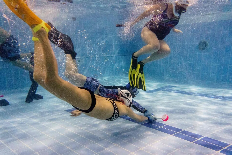 Invented by British navy divers in the 1950s, the acrobatic six-a-side sport requires participants to hunt a heavy plastic puck and hit it into their opponents' net with a short curved stick.