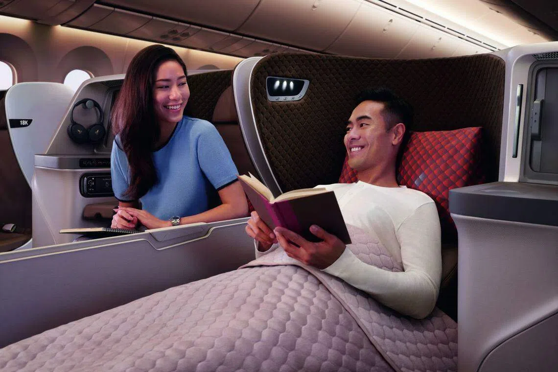 SIA's 787-10 aircraft are specially fitted with new regional Business Class seats that recline directly into a 76-inch fully flat bed. The 1-2-1 seat configuration means that you have direct aisle access no matter where you're seated. With adjustable armrests, you can easily find the most comfortable position for a good rest even on a short trip. And if you must do some work, a business panel has all the connections you need, and an integrated light that you can finetune lets you read with the perfect illumination. Convenient storage spaces let you keep your laptop and paperwork out of the way.