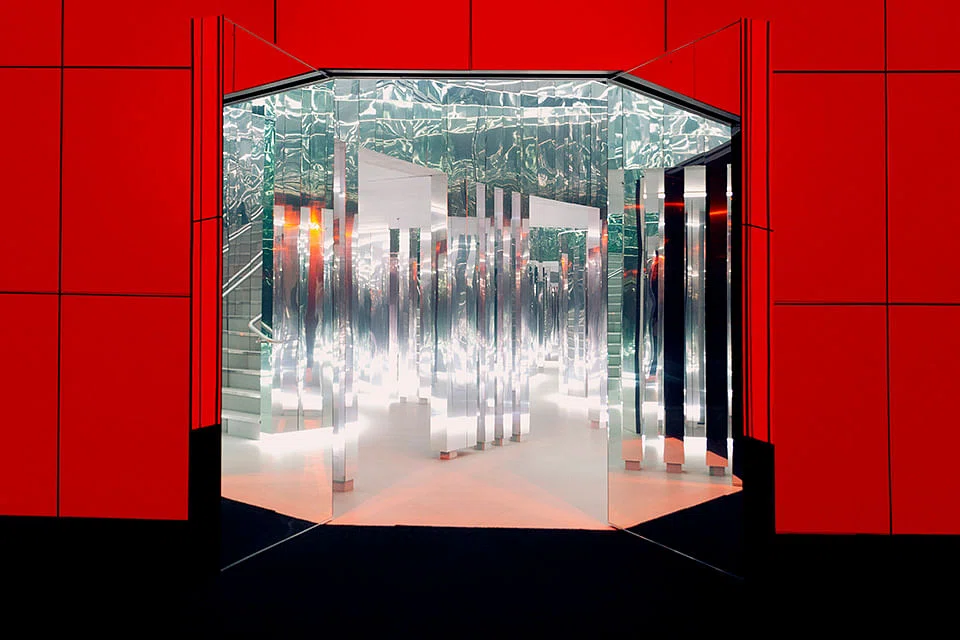 Forest of Us begins with a film of almost three minutes in which Devlin depicts branching - bronchi in the lungs, limbs of trees, rivulets into streams. The voice-over starts, "Every time I reach a fork in the road, I choose both paths," and ends, "Can you find it? Go and find it!" At which point the screen parts, and the visitor walks through a portal into a maze. With stretched Mylar film on the ceiling, optical-glass mirror on the surrounding walls and winding paths bordered by polished aluminum dividers, Forest of Us is a kind of hedge maze in which the traditional boxwood has been replaced by reflective surfaces.