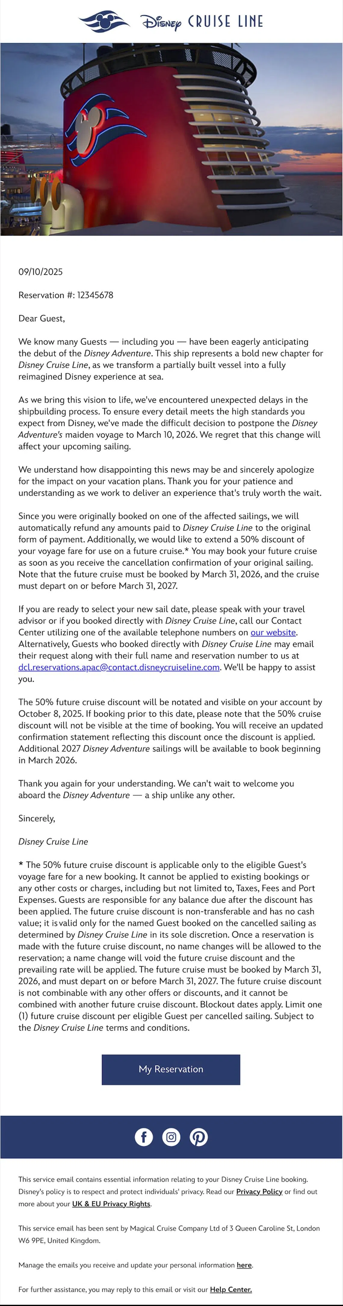 The ship’s maiden voyage will be postponed from Dec 15 to Mar 10, 2026, due to shipbuilding delays. An official statement from DCL stated that voyages scheduled from Dec 15 to Mar 12, 2026, will be impacted.