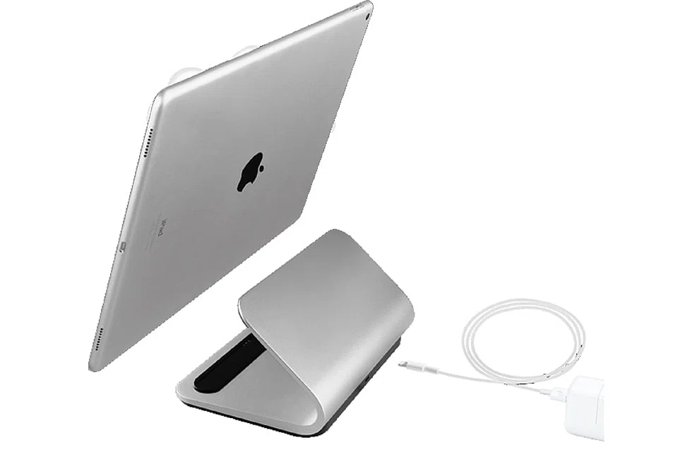 Magnets hold the iPad Pro in place, so users do not have to align the three pins on the Base to the circles on the tablet; there is even a slight cradle, to hold the tablet in place. Once the tablet is close enough, the Base magnets "tug" at the tablet, and guides it in.