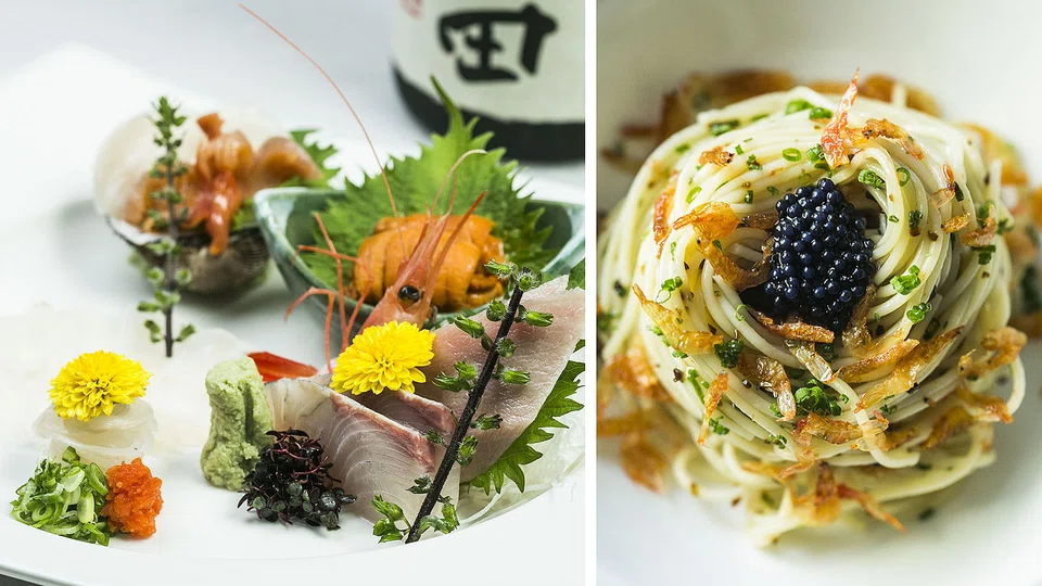 The ubiquitous sakura ebi pasta (S$32) is served here slightly chilled, tossed in white truffle (again) oil, minced shio kombu (salted kombu strips), chives and ikura that you need to mix thoroughly to savour the crispy shrimp against the marinated angel hair pasta.
