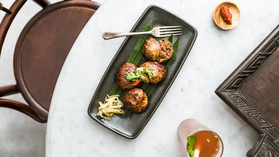 But there is so much good stuff to eat that you'll hardly miss it. It's hard to categorise the food as Peranakan although much of it is. It's mostly Peranakan, partly Eurasian but 100 per cent Chef D'Silva - who for a big guy cooks like a mak nenek. There is so much love and care in the cooking, like the way the pork is ground in a specific way to best hug large chunks of prawns and water chestnut before it's massaged with a bit of five-spice and deep fried in a wrapping of beancurd skin. The resulting ngoh hiang (S$14) is a heavyweight that knocks its lesser rivals out of the ring.