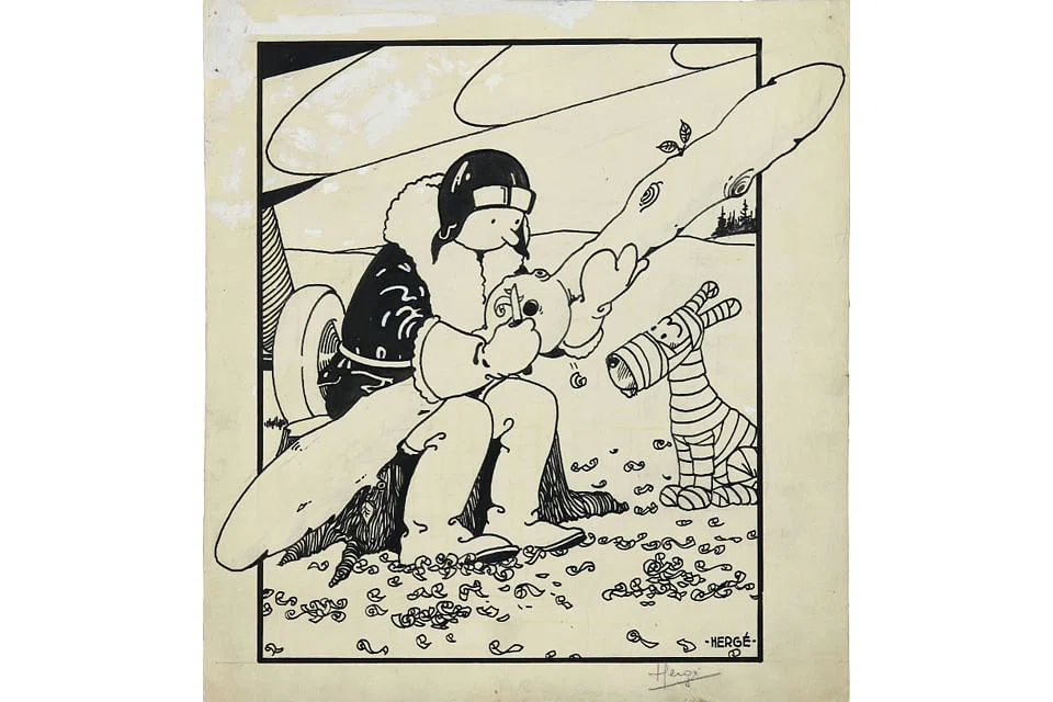 The illustration, by Tintin creator Herge (the pseudonym of Belgian cartoonist Georges Remi), shows the plucky young reporter sitting on a tree stump carving a makeshift propeller for his plane after the original was damaged in a rough landing somewhere in the Soviet Union.