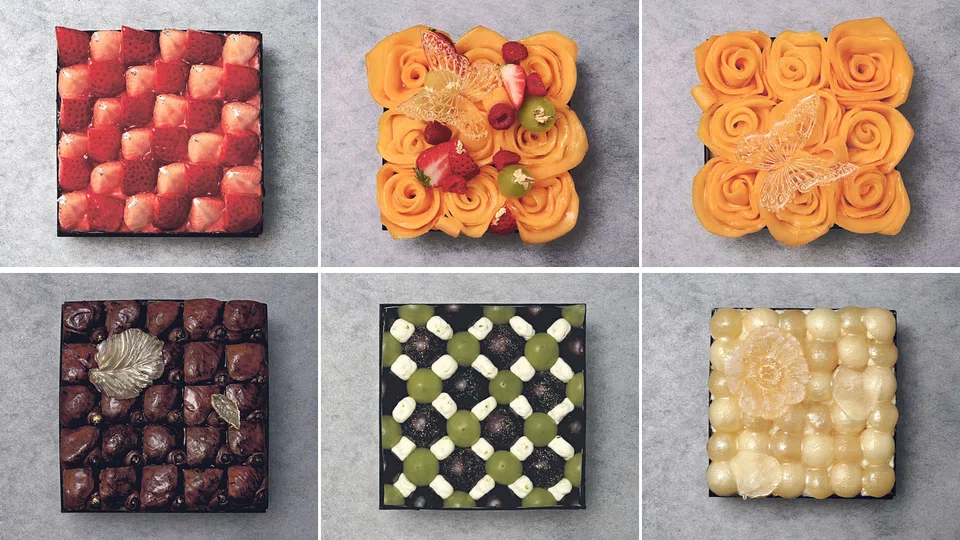 Also fascinated with Louis Vuitton's Damier or 'checkerboard' print, she replicated it in her Damier cake using Akahoppe red and Awayuki white strawberries atop a sponge cake layered with the sliced berries. On top of that, "My Bouton (French for 'button') cake alternates Shine Muscat and purple Nagano grape varieties with dollops of lime-flavoured mascarpone cream, arranged to look like Commes des Garcons' dot pattern."