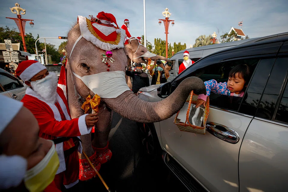 CHRISTMAS and Thailand's love of elephants combined on Wednesday when four of the giant creatures dressed as Santa turned up at a school just outside Bangkok, complete with huge coronavirus masks.