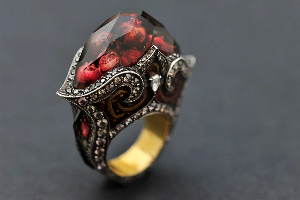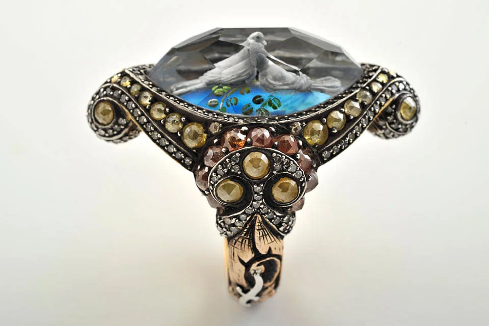 Indeed, his oversized, domed rings are not for the sartorially bashful. Often combining a catalogue of techniques resurrected from the past, each design is a detailed tableau encapsulated in an accessory. A rose quartz cabochon could house a miniature, three-dimensional representation of the Hagia Sophia - an Istanbul monument that began as a Christian basilica, became an imperial mosque and is currently a museum. This almost-hologramic effect is achieved by intaglio, a kind of reverse carving from the underside of the domed gemstone to project the design out to the viewer.