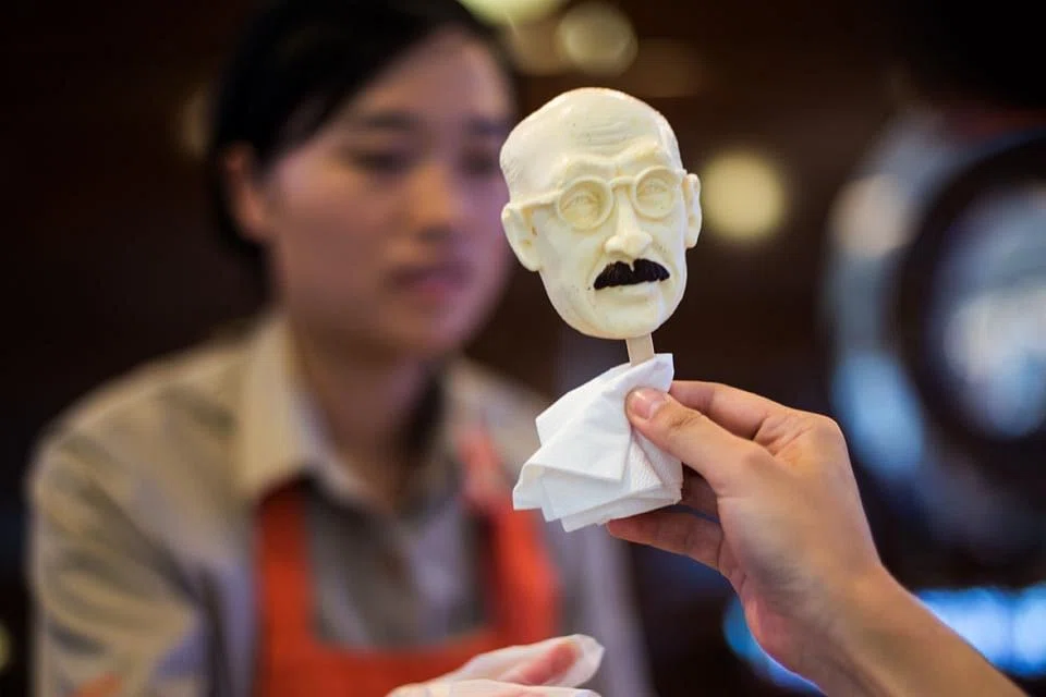 Ice cream parlours are selling ice cream bars on a stick with the image of Tojo, former Japanese army general and prime minister, in a campaign with the slogan "10,000 people together eat the Japanese war criminal".