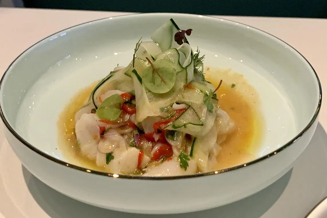 Still, at least the server also recommends the better value St Jacques (S$28) - a ceviche of good, fresh scallops thinly sliced and cured in a citrus dressing, coloured with strips of red pepper and a crown of shaved marinated cucumber.