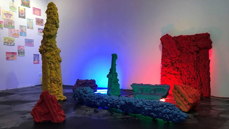 [scald=247978:article_inline_image] Only Losers Left Alive - Part Two at Yeo Workshop imagines a post-apocalyptic scene with works such as Masuri Mazlan's decaying sculptures (foreground) and Geraldine Lim's quirky drawings of an amphibious creature (background).