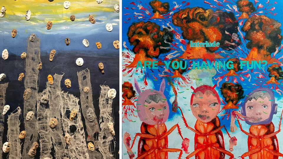Only Losers Left Alive - Part Two at Yeo Workshop imagines a post-apocalyptic scene with works such as Masuri Mazlan's decaying sculptures (foreground) and Geraldine Lim's quirky drawings of an amphibious creature (background).