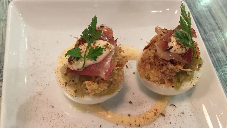 Devilled eggs (S$8) feel like unsuspecting creamy egg yolk-stuffed appetisers on their way to a canapé party who are kidnapped and filled with a salty-sour crabmeat mixture topped with smoky pimento cream and a slice of home-made duck prosciutto. Our tastebuds are equally shell-shocked by the combination.