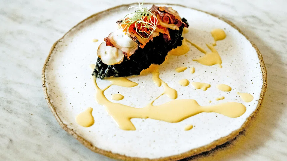 An old dish - poached octopus on squid ink risotto with salted egg sauce and tobiko (S$26) gets a smart makeover, classily presented with grainy salted egg sauce spooned into a pattern around somewhat stodgy black rice covered with tender, perfectly textured octopus.