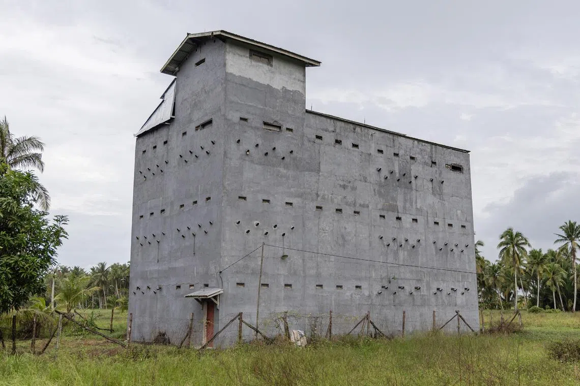 WITH no windows, the gloomy, grey building looming four storeys above the rice fields in a remote village in Indonesia’s Borneo resembles nothing more than a prison.