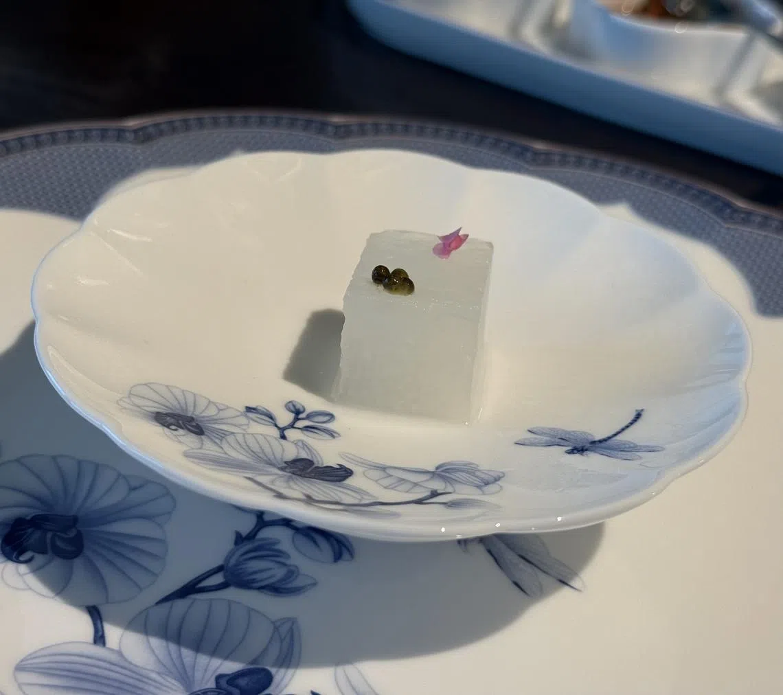 Eventually, though, you’re fed an amuse bouche. A single square of winter melon is presented like a piece of still art: pristine, slightly pickled, garnished with four pearls of caviar and a single pink flower petal. A hint of chilli. It’s presented with a proud flourish. Not sure if we’re supposed to clap.