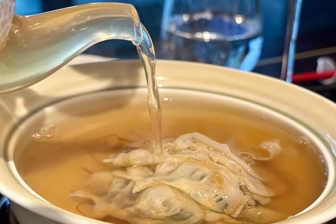 Hokkaido squid is overpriced at S$98, but super addictive. It’s blanched and chilled for an ideal smooth and tender bite, bathed in a creamy peanut chilli oil dressing. You can also choose a scallion sauce, similar to the kind you get with poached chicken. They’re kind enough to give us a little taste of it.