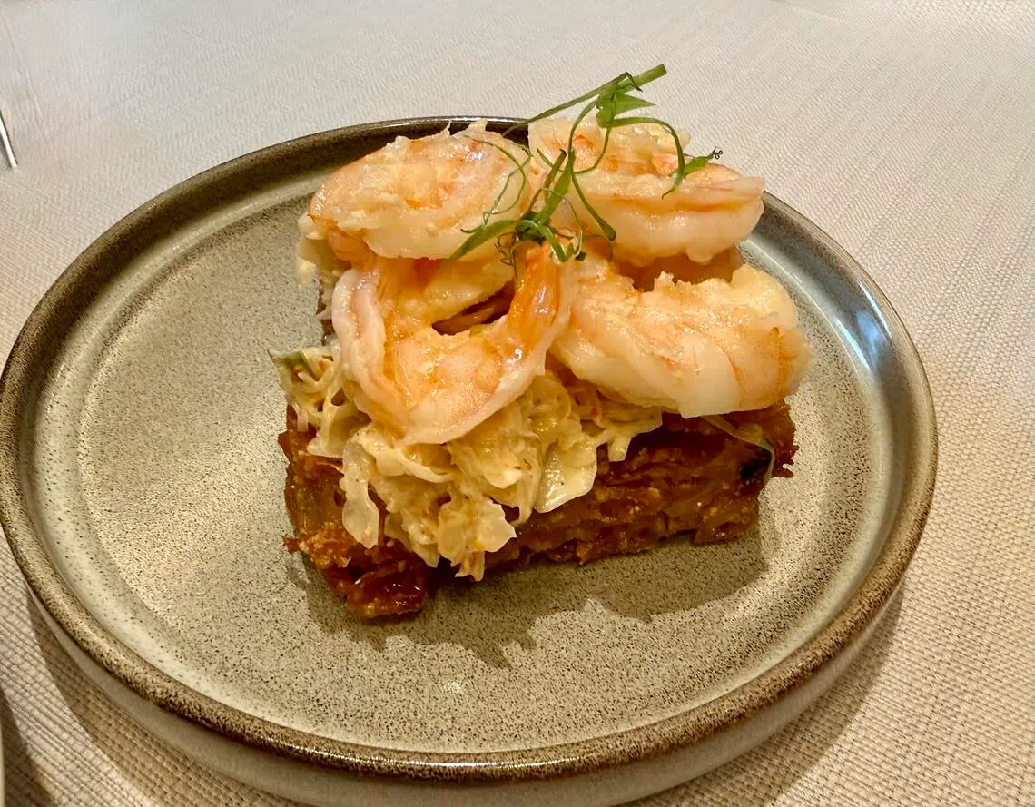 Prawn macaroni toast (S$9) is circa 1950s wedding banquets. Mess be damned as you attack these retro deep-fried squares of compressed pasta topped with a bit of shredded chicken salad and fat prawns. Eat them fast before the macaroni cools and hardens a notch.