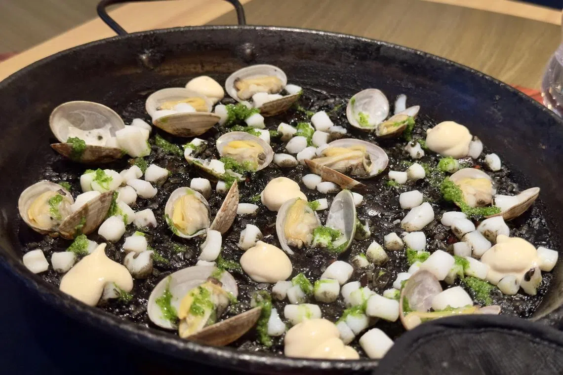 Squid ink paella (S$74) gets it right. Infused in a rich stock, the rice is al dente and burnt in the right places, with barely cooked clams and bits of squid.