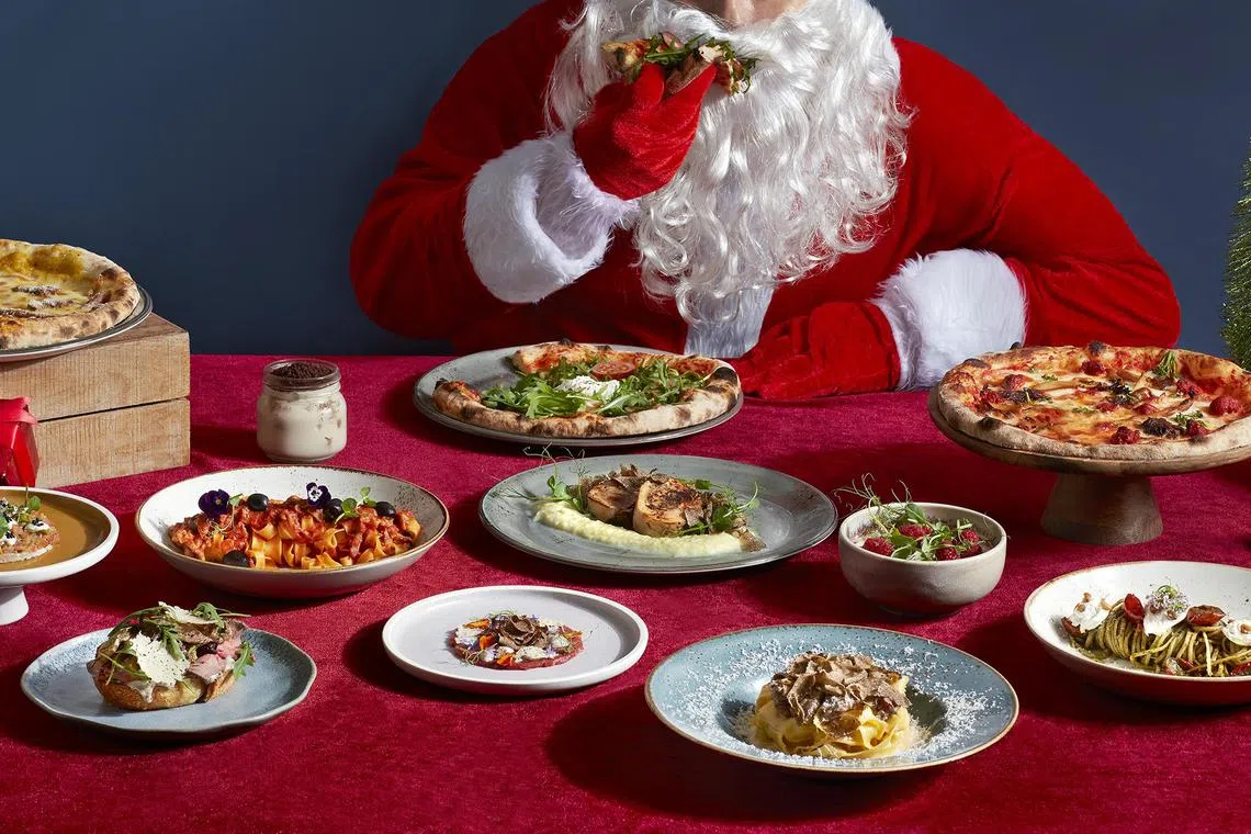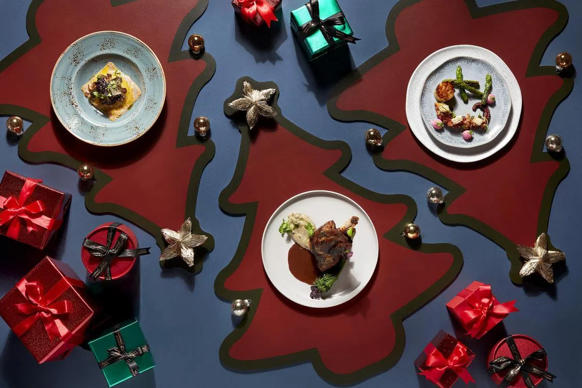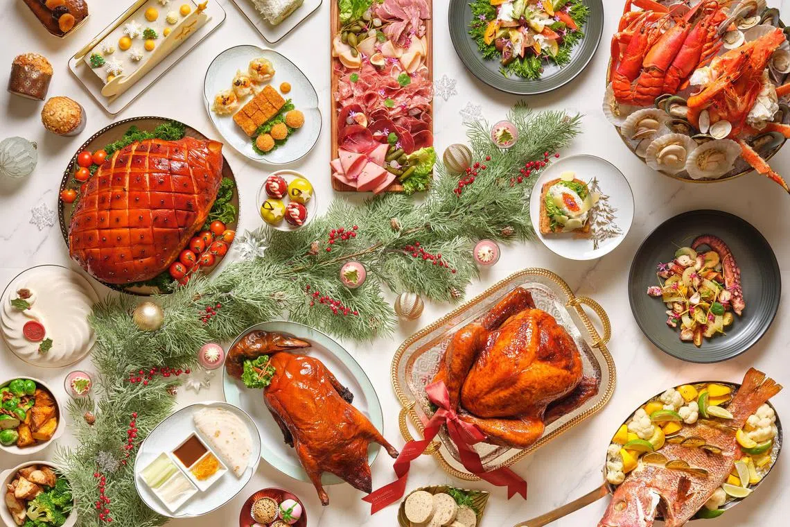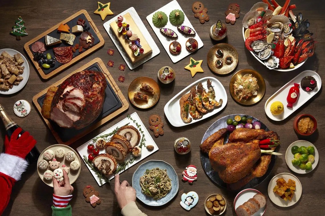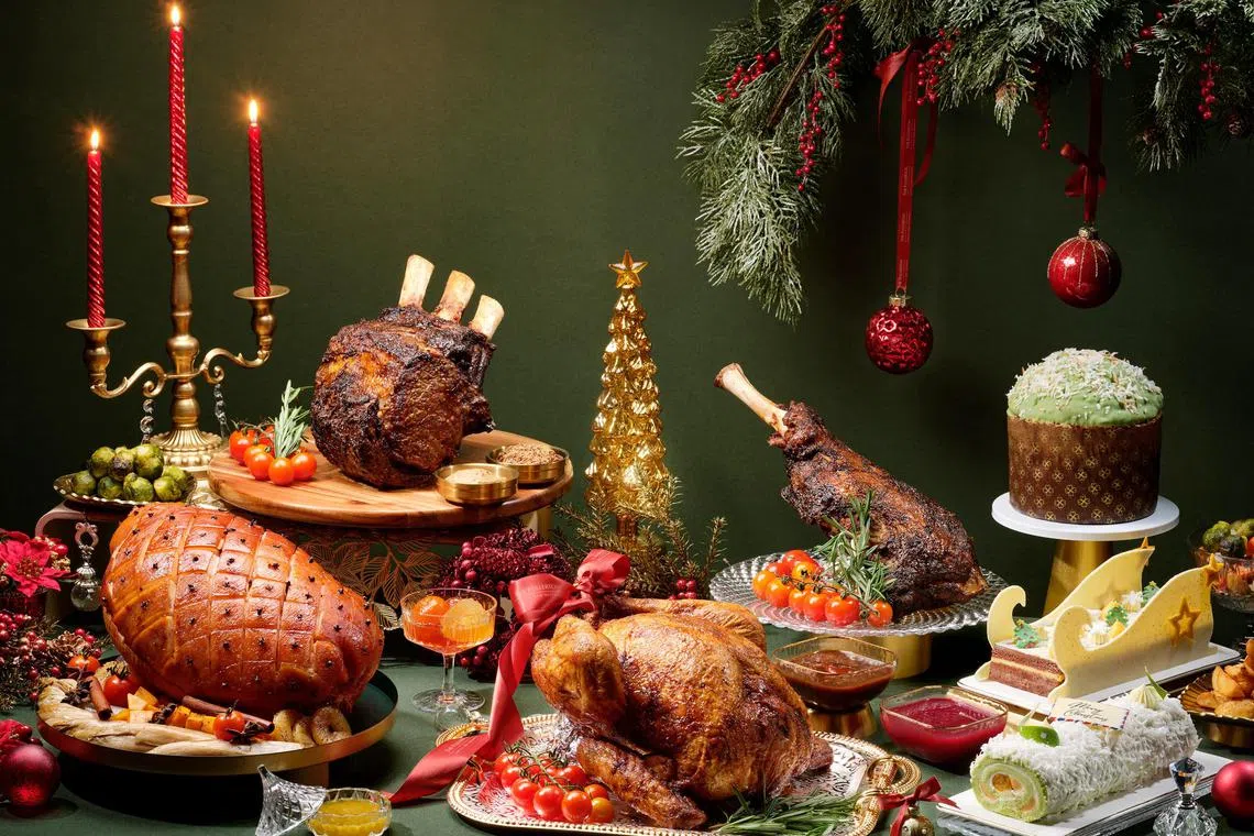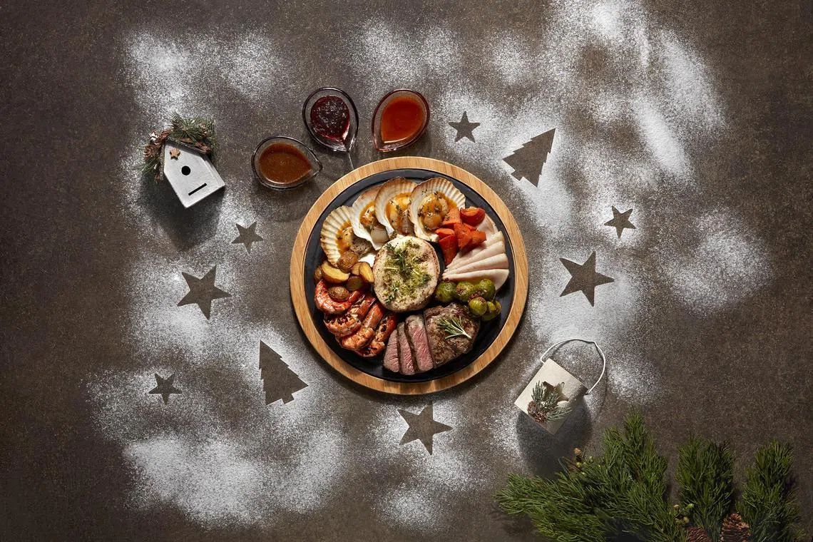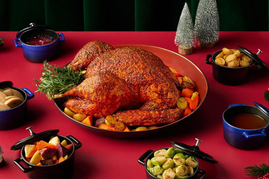 Impress your guests at home with festive takeaways that include a Mediterranean-style whole roasted turkey (S$190), Angus beef wellington (S$228) encased in tender puff pastry, and salmon wellington (S$188) with a lemon beurre blanc sauce.