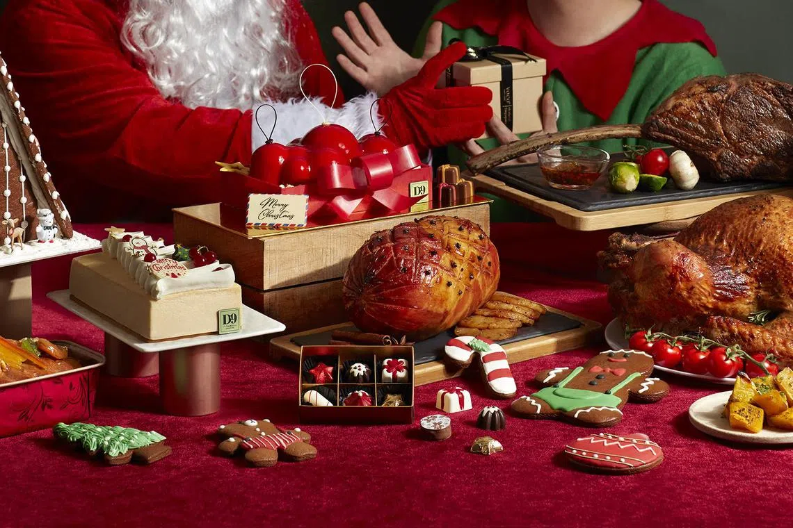 Take the opportunity to also order a takeaway menu for an impressive Christmas dinner at home. Besides classic roast turkey (S$228) and honey orange-baked ham (S$178), pick from the signature D9 classic American cheesecake yule log (S$85), the new zesty yuzu raspberry buche de noel (S$95), panettone and chocolate truffles.