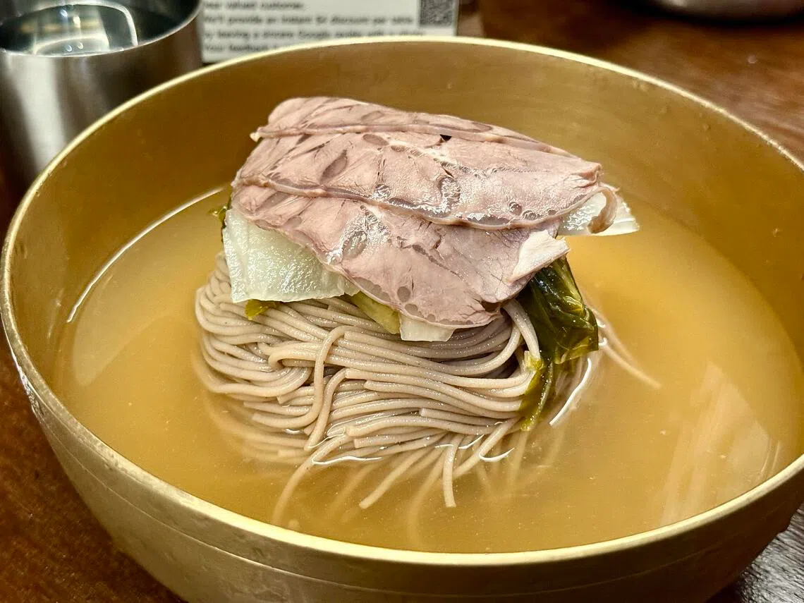 On the other hand, the 100 per cent buckwheat noodles may be authentic but aren’t much fun to chew – fine if you’re on a soft diet but not if you want something higher on the “QQ” meter. Plus, the Pyongyang Naengmyeon (S$25) could use a refresher course in North Korea so it remembers how cold it should be – ours is only slightly cool, the otherwise delicate beef broth diluted by the ice that used to be in it.