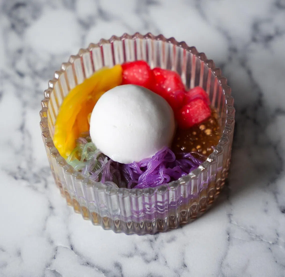 Red ruby (S$7.80) is of course an old favourite, but with a new twist. Familiar chewy-skinned water chestnut, jelly strips and jackfruit are paired with intriguingly smoked coconut sorbet and sweetened with a sugar syrup heavily infused with jasmine.
