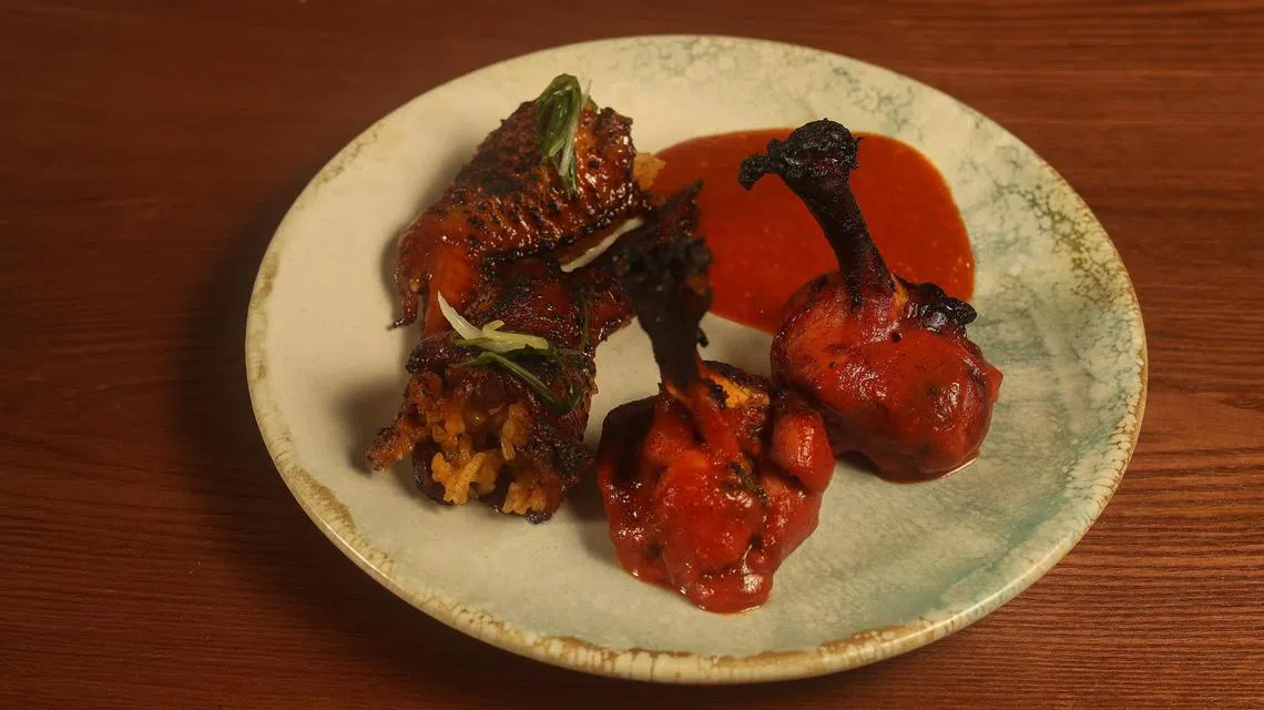 Bak bak wings (S$28) are overpriced. We get the equivalent of two chicken wings and the experience of having consomme poured from a fancy vacuum coffee maker infused with herbs. Like annoying five-year-olds, we can’t stop asking “Why?”. Why is the mid-section of the wing stuffed with chicken rice infused with vinegar, and why complicate it further with char siew marinated drumettes? The chicken rice chilli has a nice kick but, otherwise, it feels like a lot of fuss for nothing.