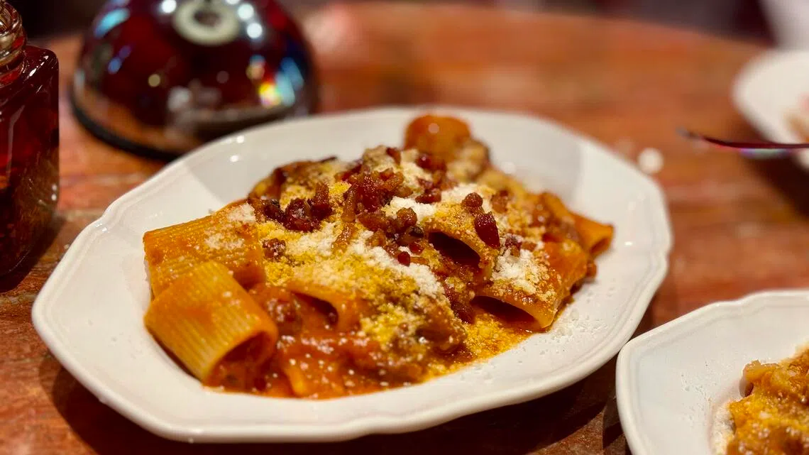 He helpfully offers us half portions of pasta, and suggests casarecce (S$35) and mezze maniche (S$32). They’re like twins who change their hairstyles so you can tell them apart. Same tomato-based sauce but different pasta, and one with added egg yolk and Italian sausage. Both are equally stodgy.