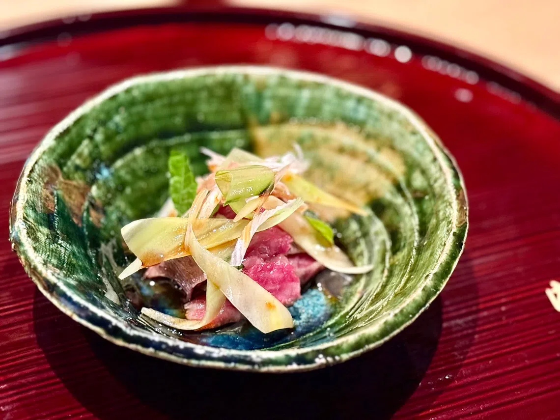 Nikuya Tanaka serves a fair bit of raw beef, which is a sign of confidence in its produce. The first standout is a maki that layers glistening meat and white fish (hirame) with chives, shiso leaf, shredded ginger and pickled strips of turnip. Rolled in nori, it’s a satisfying jumble of textures and a clever mix of surf and turf.