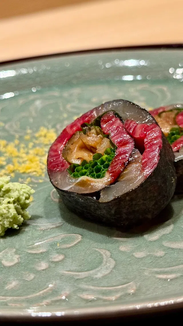 Not every course is a meaty one, though. There’s sweet Gifu persimmon with caviar and tofu cream to start, while the maki is followed by a comforting bowl of dashi housing a delicate ball of hairy crab (kegani) meat. It’s served piping hot, decorated with yellow flower petals.
