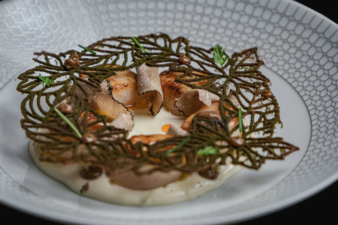 We also get Hokkaido scallops (S$32) – properly grilled and firm, paired with chunks of smoky bacon in a classic beurre blanc sauce. A crispy garland of interlaced, leaf-shaped savoury tuiles shows attention to detail.