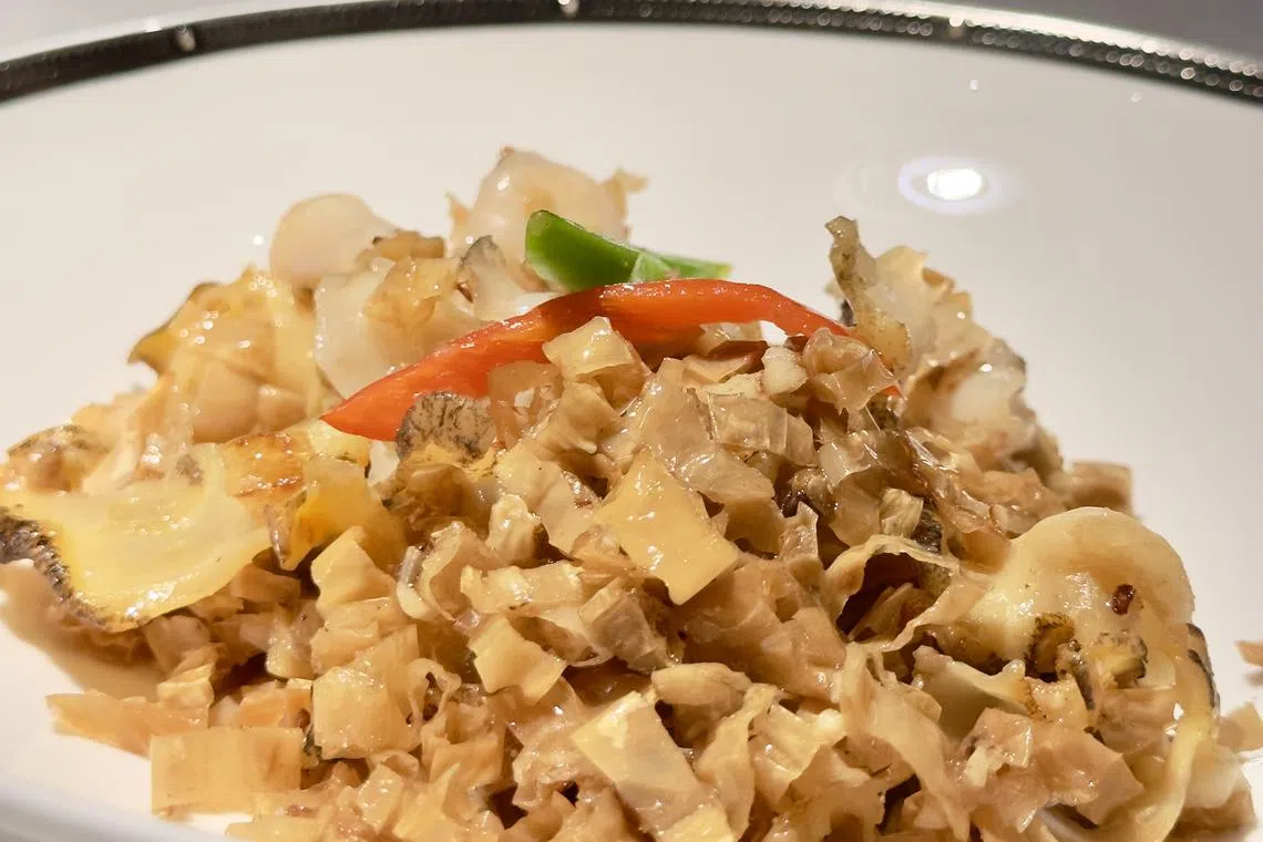 Picking up the pace is stir-fried conch – crunchy clam slices tossed in sliced white chillies that look almost like shredded beancurd skin, with a perky hint of heat.