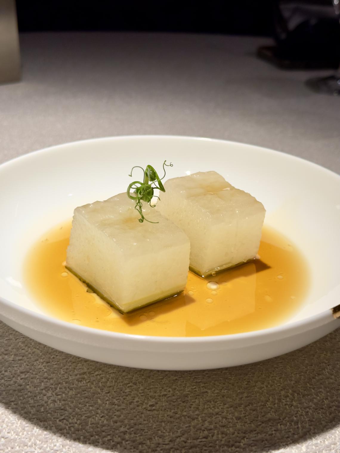 Service is so attentive that there is someone stationed in the dining room throughout your meal, even as the servers deliver your courses at near breakneck speed. We’ve barely scraped out precious morsels of raw swimmer crab – swimming in a gutsy marinade of wine, ginger, garlic and chilli – when squares of cold, meltingly-soft winter melon arrive. Described as pickled but more like tickled with vinegar, the refreshing, fall-apart cubes of gourd have a subtle infusion of sesame oil that makes it stand out.