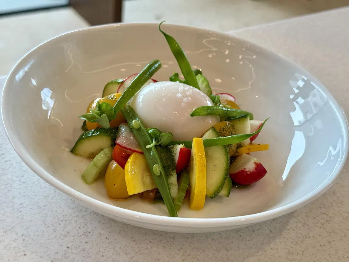 When the food comes – which can be all at once – it’s not half bad. A salad of crisp vegetables (S$16) has a mix of zucchini, green beans, baby radishes and cucumber in a refreshing crushed-tomato dressing, topped with a cold soft-boiled egg. It’s artfully arranged, pretty and almost chic looking.