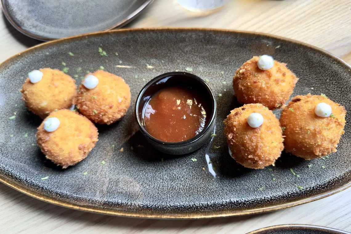The most variety you will get is a charcuterie platter, cherry tomato salad or grana padano balls. We choose the latter (S$18) – crunchy crumb-crusted morsels of melty cheese, paired with a very sweet tomato jam that’s a better fit with dainty English scones than scrappy cheese balls. But it does help cut the saltiness of the cheese.