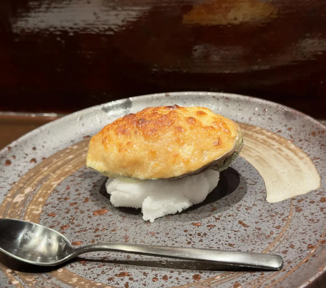 Among its hot starters, tempura of snow beef wins you over with melting-soft, pink-cooked fatty wagyu cubes quivering under their crunchy batter coating. Not so appealing is a gratin of ama ebi and awabi – pieces of shrimp and abalone mired in a thick magma of miso bechamel, covered in a layer of hot and chewy broiled cheese. The bechamel is so rich and distracting that the abalone could have worked from home and sent its cuttlefish underling in its place. No one could tell the difference.