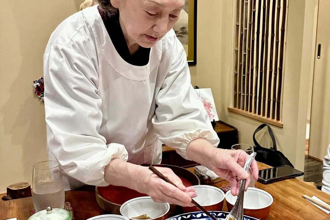 Think freshly caught octopus braised in sake, ika sashimi served in a sauce made of its own liver, sashimi (again in a fancy platter) and sushi of Aomori uni and spring ocean trout. It feels like you’re in a different era.