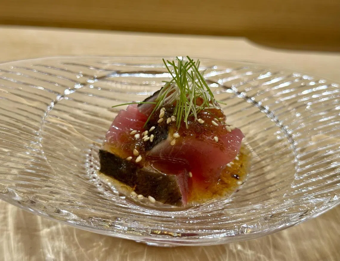 We confess we took the bait and went with the pricier option. The two otsumami seem skimpy, though: a little dish of fresh bamboo topped with a perky paste of kinome leaves; and an equally small dish of mountain vegetables and tuna cubes in a tofu sauce.
