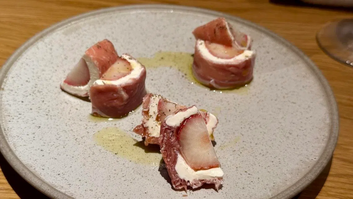 Such as a soundtrack that blasts loud, weirdly retro music that sounds like Spotify for Japanese aunties. Or how you distinctly remember ordering a prosciutto-wrapped cream cheese and shine muscat maki (S$28) – but instead a strawberry elbows itself into the space where the grape should be, daring you to call it out as an imposter.