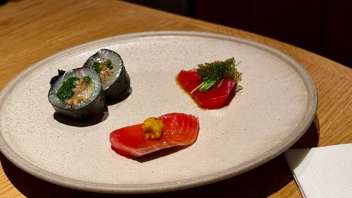 But someone is having a champagne-whisky highball (S$18) – which is apparently cheap and very nice – and so is more forgiving of this fruity deception. Never mind that the combination is waxy, tart and violates every self-respecting maki roll’s code of professional conduct.