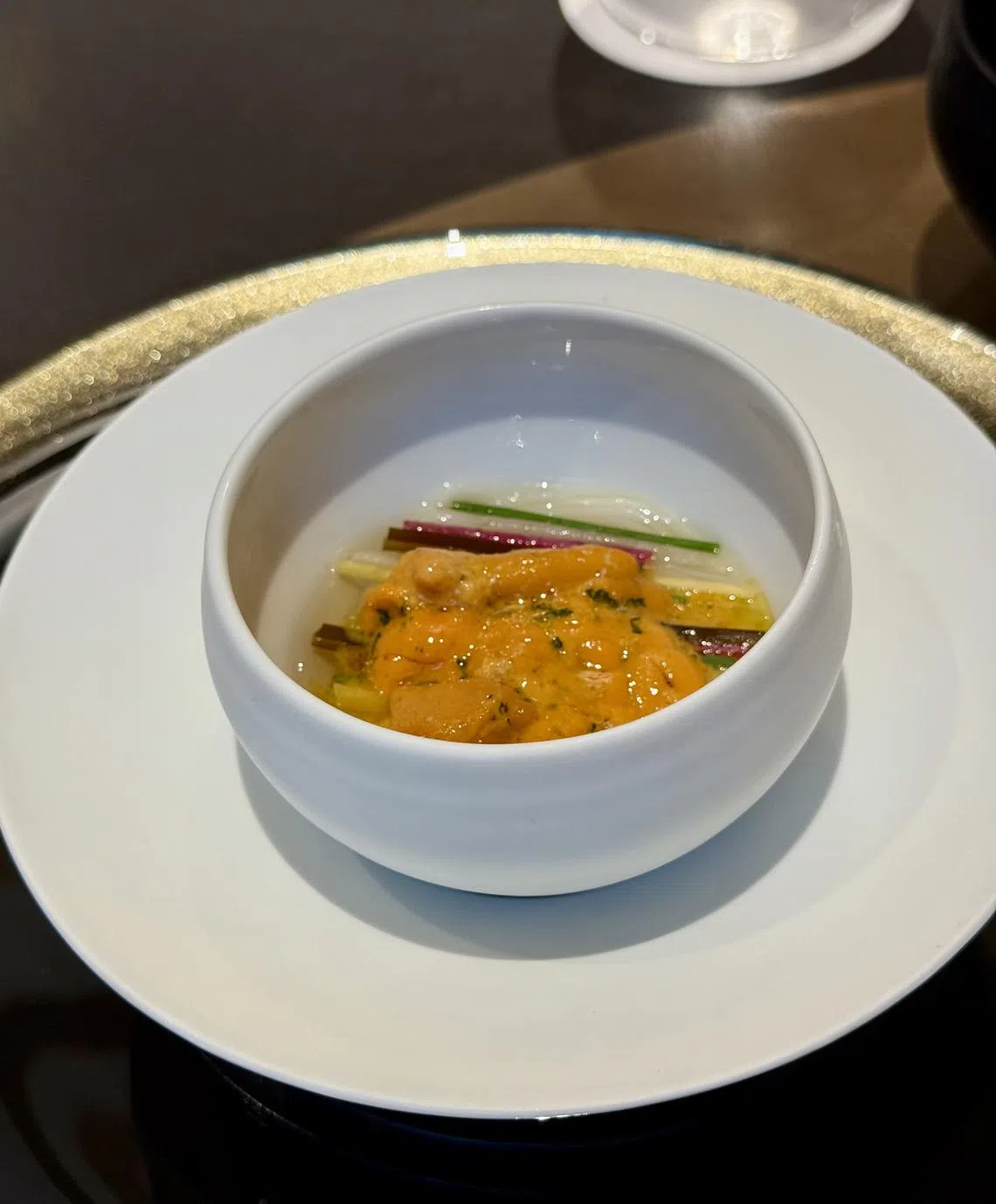 Chewy cold somen is decorated with finely julienned multicoloured radish and chives, mixed with the sweet funkiness of uni for a mouthful of texture and brine.