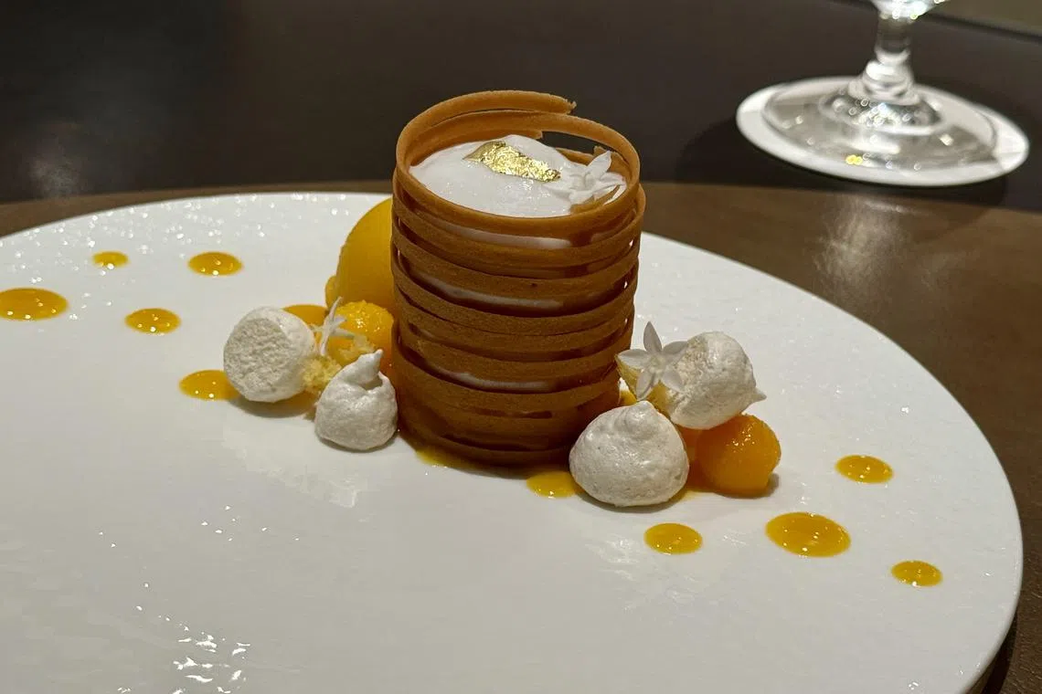 You can see the extent of Arimoto’s attention to detail from the way he painstakingly assembles a swirl of love letter-like cookies into a tall crispy nest filled with coconut mousse, paired with mango sherbet, passion fruit jelly and meringue. For good measure, he uses expensive Miyazaki mangoes and coconut from Okinawa.