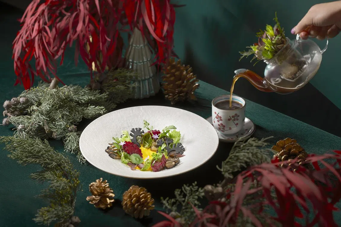 For easy entertaining, takeaway sets are curated for small to large groups. The Joyous Revelry set is priced at S$498++ and feeds three to four people, while the Yuletide Feast is good for eight to 10 guests at S$888++. For a more indulgent feast, the Merriment Splendour set also feeds eight to 10 guests at S$1488++. Two days advance notice is required.