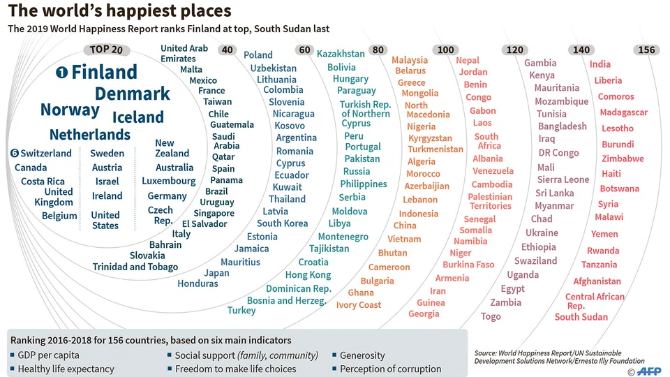 Ms Yeo and Ms Chua think Asian collectivism could partially account for why Western countries dominate the list of the top 20 happiest countries in the world. Four of the highest ranking Asian countries are Taiwan, Singapore, South Korea and Japan - all affluent countries with well-educated and healthy populations - but they sit at 25, 34, 54 and 58 respectively.
