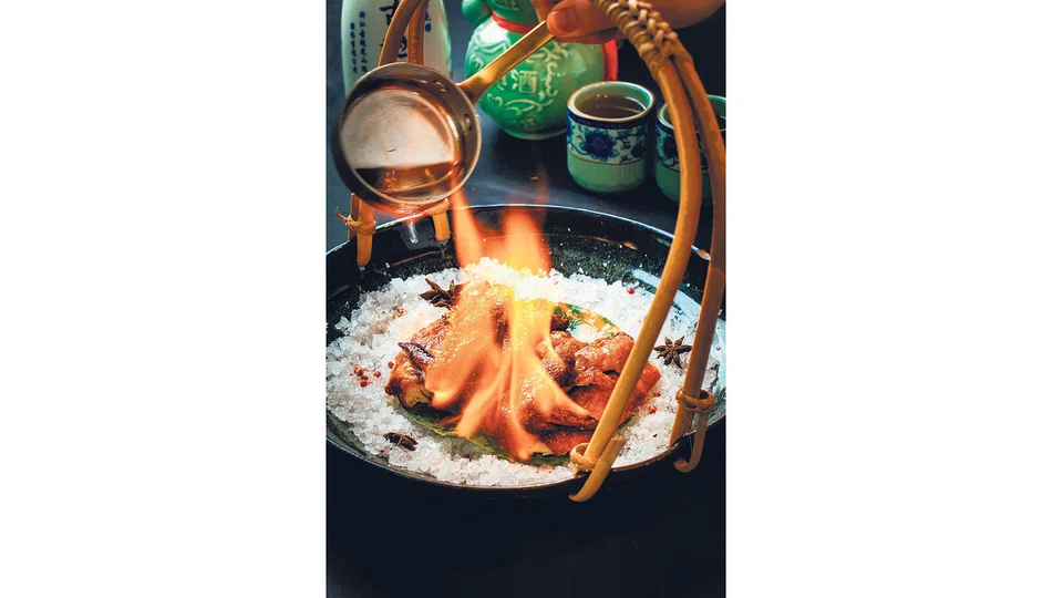 A huge slab of meat isn't limited to an American steakhouse as the recently-installed chef Edward Chong proves at the Marina Mandarin's Cantonese restaurant Peach Blossoms. Here, an entire tomahawk steak is roasted Xinjiang-style, marinated with spices such as cumin and black pepper, served neatly sliced with a crisp and refreshing green papaya salad. While staying true to the principles of Cantonese cooking, chef Chong's new signature dishes incorporate contemporary Asian touches. His version of drunken chicken features a wine-soaked spring chicken gently fried and flambéed for a crispy finish. Meanwhile, tom yum soup is served in a whole coconut with prawns stuffed with otak, and steamed fish gets a Spanish touch with cured Iberico ham to amp up the seasoning. Of course, if you still want your familiar dim sum, its lunch menu features favourites such as vegetarian crystal dumplings and poached shrimp dumplings in spicy Szechuan sauce.